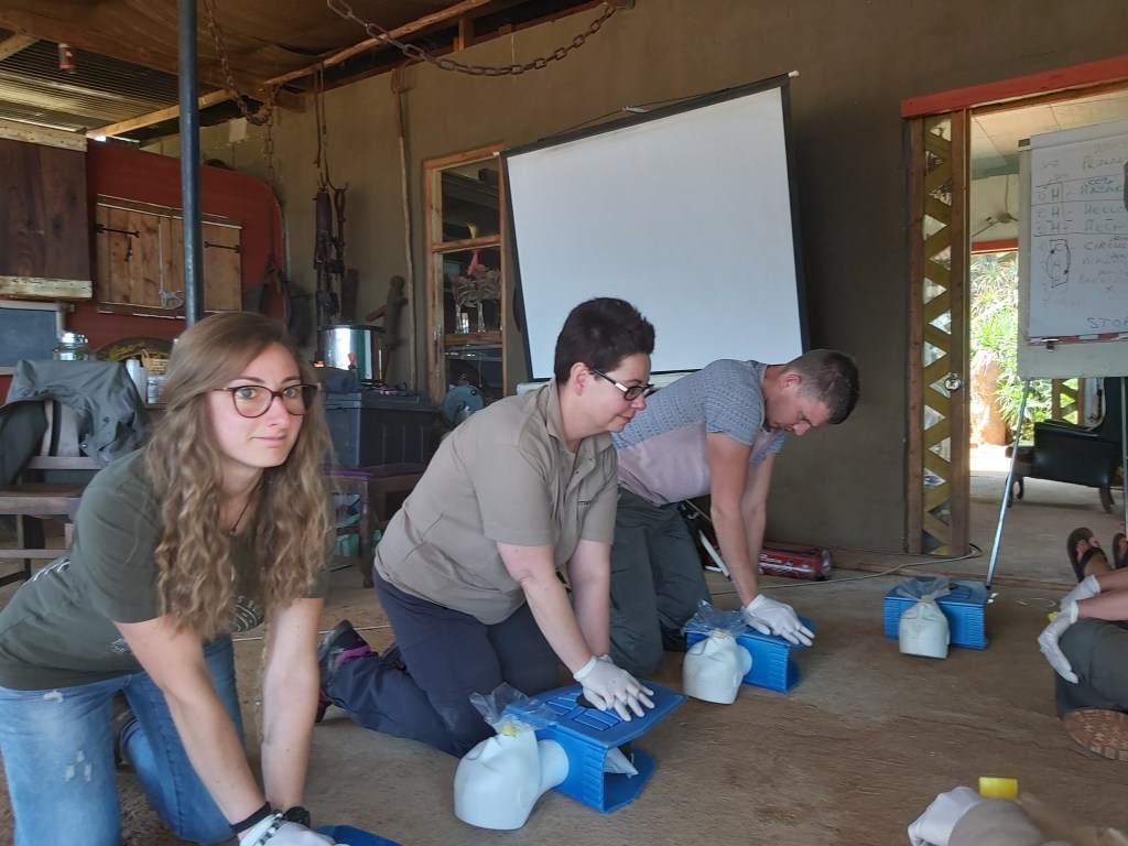 During the first aid course we learnt a lot about the dangers that we might face in the bush. Andrew did an excellent job by introducing us to the human body and all kind of first aid procedures. He was a good teacher and did not get tired to tell us all kind of different stories about things that can happen: Snake- and spider bites, scorpion stings, being dragged out of the tent by a leopard (never leave the tent open when sleeping!), bitten by a lion, ran over by an elephant, and some other stories were on our agenda. I was surprised that all of us still wanted this adventure.