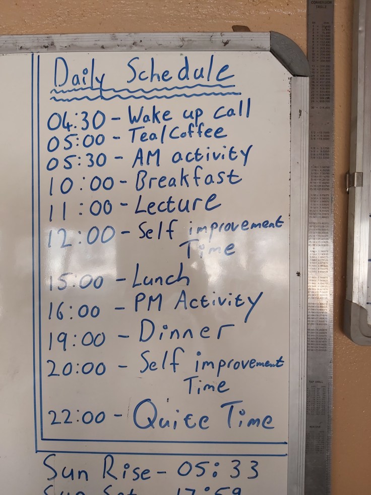 We quickly threw our stuff inside the tent and met our instructor David who presented us our schedule for the next weeks. When I saw it, I thought they are joking, but I quickly found out that they weren´t. Im an not an early bird. I am the opposite, I am a night owl. But we will see how it works out.