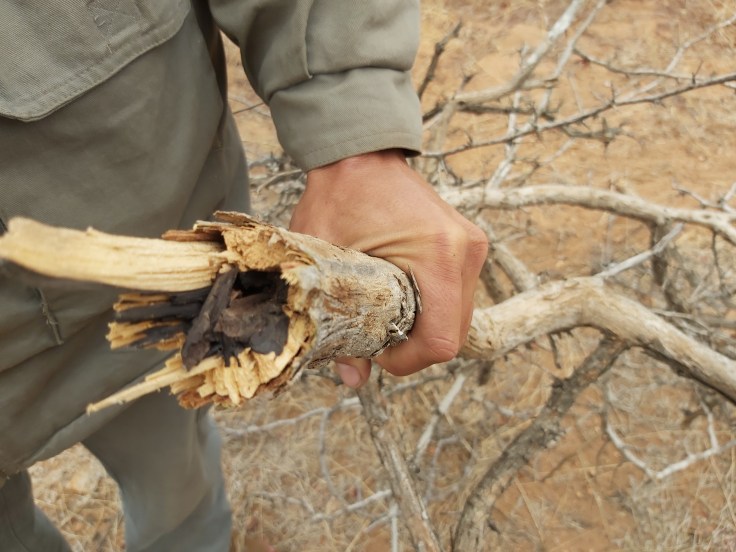 Instructor David shows us the Zebrawood, one of the strongest and hardest trees in South Africa. It got the name from the black-and-white texture that reminds one on the colouration of a zebra. It can be used to treat diarrhoea, headache, bronchitis and colds, rheumatism, prevent miscarriage, treat gonorrhoea, stomachache and abdominal pain, to clean wounds, relieve pain in joints and to treat inflammation in mouth and throat. Due to its black and white texture, it is also often used for furniture.