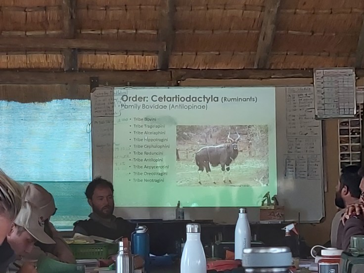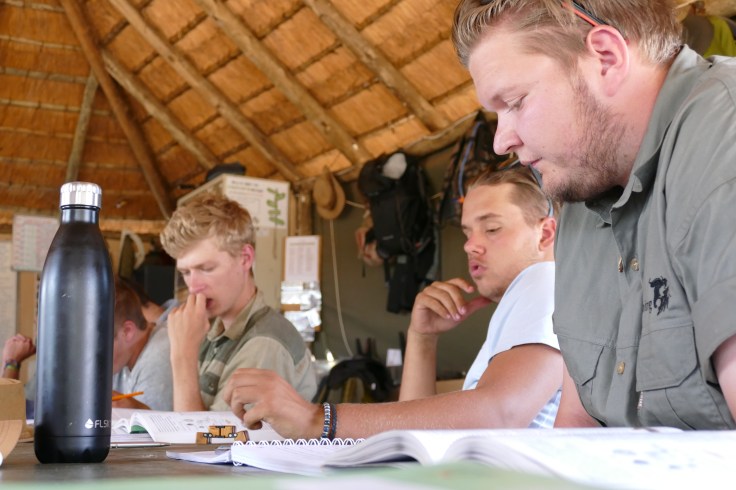 Game drive, breakfast, lecture, lunch, study time, game drive, dinner, study time.