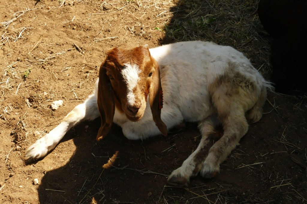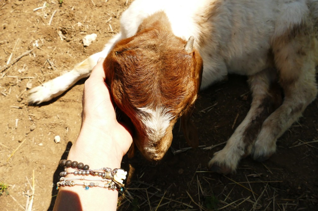 I love our goat babies, they are so cute! But I especially fell in love with “sunflower”, who didn´t really have a good start into life. She had a very bad orf infection that made drinking painful and nearly impossible. Orf is a virus disease that primarily occurs in sheep and goats. It is very contagious and also known as “scabby mouth” disease, which makes sense to everybody that has ever seen the result of this infection. I would compare it to a very bad herpes and sunflower was hit by it very hard. Her mouth looked terrible and was bloddy and earned her the nickname “Orfi”. But after some weeks of special care and away from her friends, everything healed very nicely and we could literally see how she improved. The formerly weak goat became energetic and started jumping around and often enough she escaped her pen.