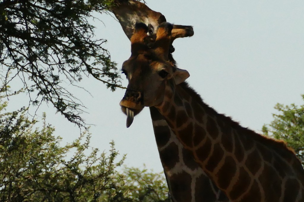 They spent nearly two hours around the waterhole. With their beautiful eye lashes, their unique fur pattern and their camel-like walk, giraffes are on top of my favourite animal list, so I appreciated every minute. Quite nice to see was their foraging and drinking behaviour. With their long neck they reach food sources that no other herbivore – apart from the elephant – can reach. Leaves up to 6 meters above the ground are no problem and with their long purple tongue they rip the leaves off the acacia trees as if it is the easiest thing to do and as if these trees had no thorns.