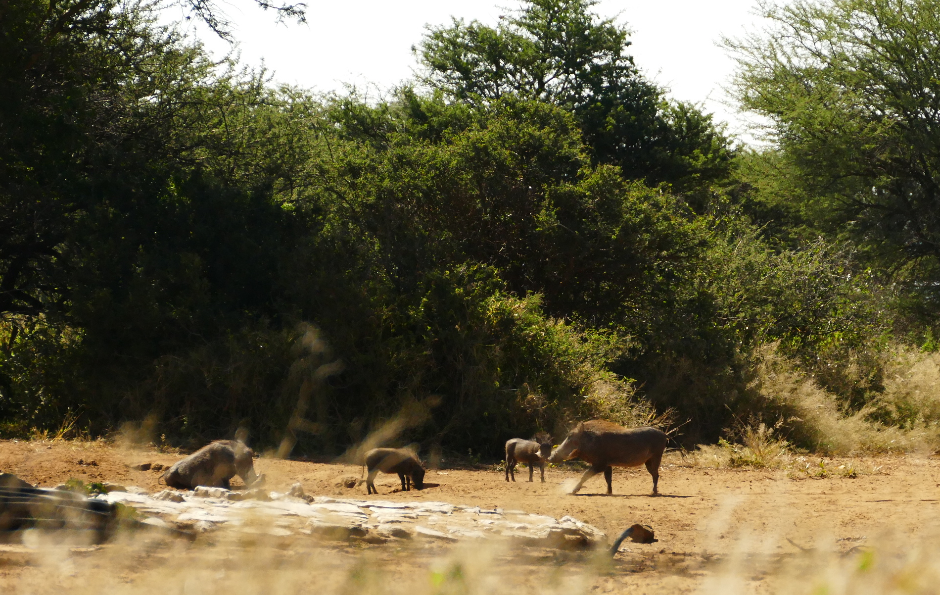 We first had a big male warthog coming along, taking a sip of water. Shortly after, a whole warthog family joint. Cute to see the little piglets dribbling around 🙂