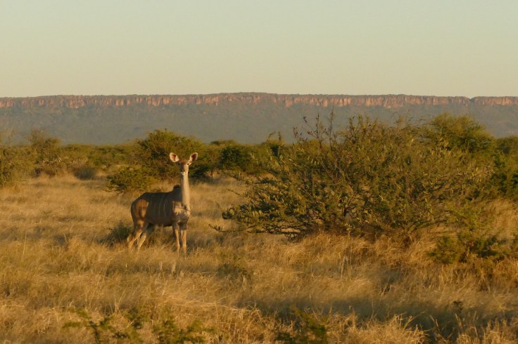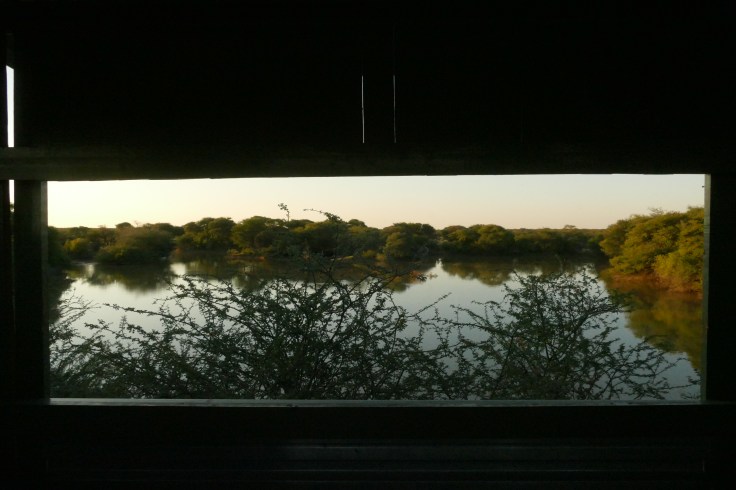 I watch the sunset. Especially nice with some clouds and the wonderful colouration of the Waterberg Plateau in the distance. I found this nice hide just around the corner, about a five minutes’ walk from my house, where I have a wonderful view on the mountains but also on a small dam. I like this spot. It is very peaceful and quiet and a good place to rethink the day .