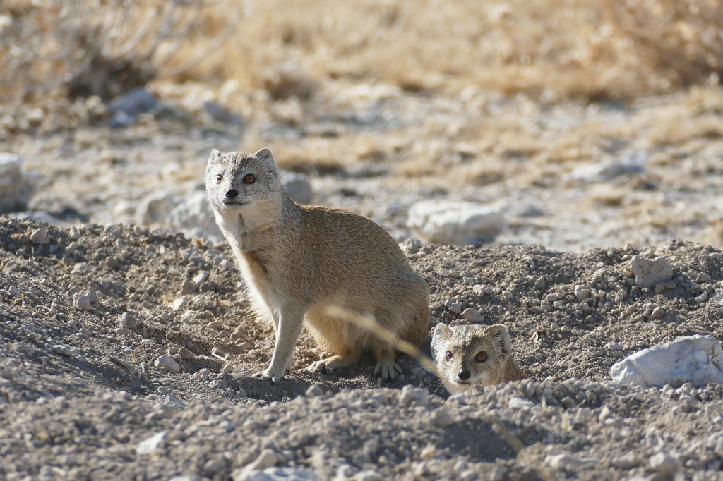 Yellow mongoose are tawny yellow to orange in colour and have a bushy white-tipped tail. They are diurnal (most active during day), territorial and live in small colonies, families or pairs. They live in dens that they dig by themselves, or they simply modify existing ones (e.g. from Ground Squirrel or Springhare). Their home has multiple entries and a underground tunnel system (sometimes shared with other species, such as Suricates).
