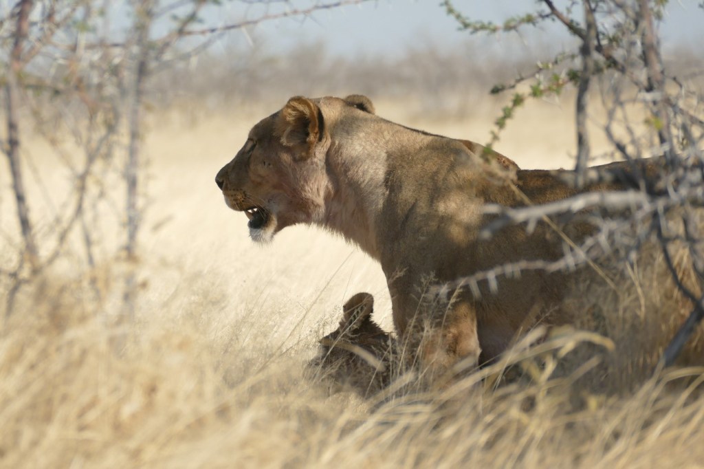 At Okaukuejo, I was happy to see the campsite nearly empty. Not that many tourists were around and I had free choice to select my camping spot. Once settled in, and after a short visit to the camps´waterhole, it was already afternoon and I decided to have a quick drive out to get an idea of the area and just some hundred metres outside camp, I had an amazing sighting: