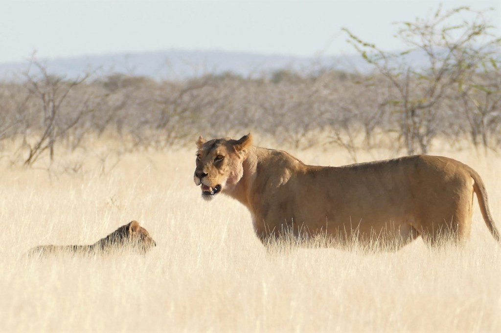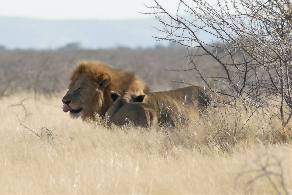 I did not have to wait too long for the black rhinos to come. A mother with a subadult and a male (I guess) came along and took a peaceful sip of water, sniffed each other, and went away in different directions. Shortly after, a single lioness came for a drink with no sign of the rest of a pride.