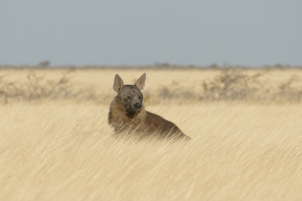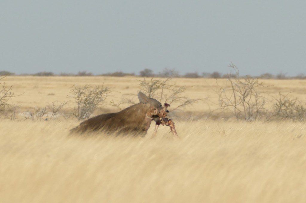 When one of the lionesses became alert, I noticed something dark moving in the distance. I could not figure out immediately what it was but it looked hyena-like. To my surprise, it was not a spotted one, but the usually nocturnal brown hyena that slowly came closer and, under the observation of the lioness, took a portion of the dead antelope and trotted away.