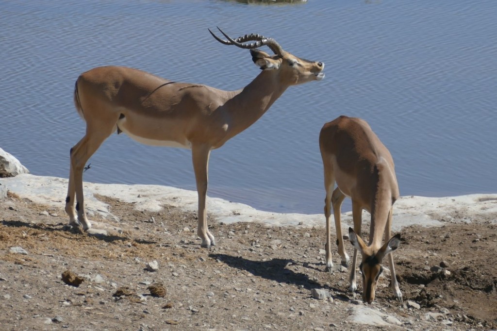Rutting season has started and the impalas show their intentions by tongue-flicking, urine-sniffing, tail-lifting and grunting. Have a look on the “funny-face” of the male when they sniff the females’ genitals. This behaviour is called “flehmen” and a typical mammalian behaviour in which the animal inhales scent with the mouth open and upper lip curled to facilitate the transfer of scents and pheromones into the vomer-onasal organ, the Jacobson’s organ, above the roof of the mouth. This is one type of communication they use. In this way they test the female’s reproductive status. I am already looking forward to the baby season!!