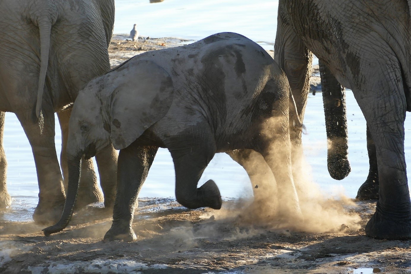 I am not sure if the young Elephant struggled or had fun. He stayed close to an adult and was obviously practising the habit of “dusting” himself. Dusting is a way to help cooling down, but also to prevent and get rid of parasites or skin irritations. Anyway, it was quite cute so see him trying to use his trunk and balance himself out at the same time. I guess it was good to have an adult close by that served as a pillar.