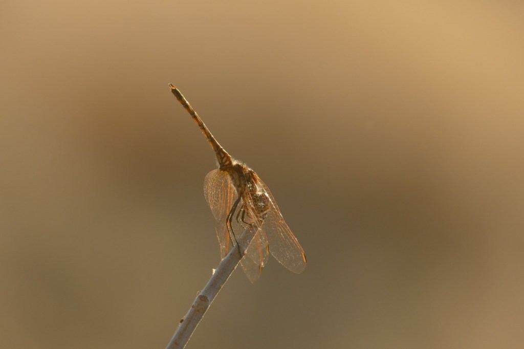 While watching the Elephants, something else, much smaller and a bit more colourful, caught my attention. This beautiful and bright orange dragonfly, that I think could be a Small Scarlet (Crocothemis sanguinolenta) or one of the Dropwings (Trithemis selika), was sitting at the tip of a branch, flying off from time to time just return to the exact same spot after a few seconds, arranging its wings in the way you see on the pictures.