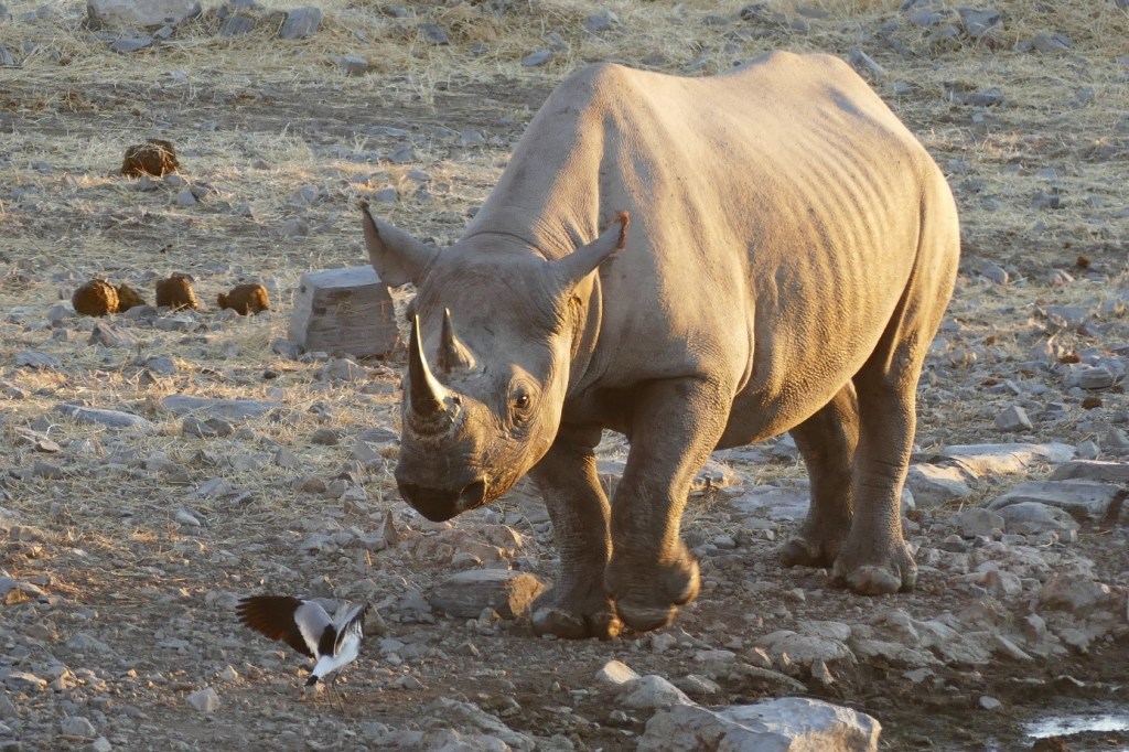 The Rhino had a bit an issue with that Blacksmith Lapwing. I am not sure if the Lapwing has a nest there or was just upset that the Rhino was walking in its way, but it was complaining constantly and flying around. Didn´t bother the Rhino too much though.