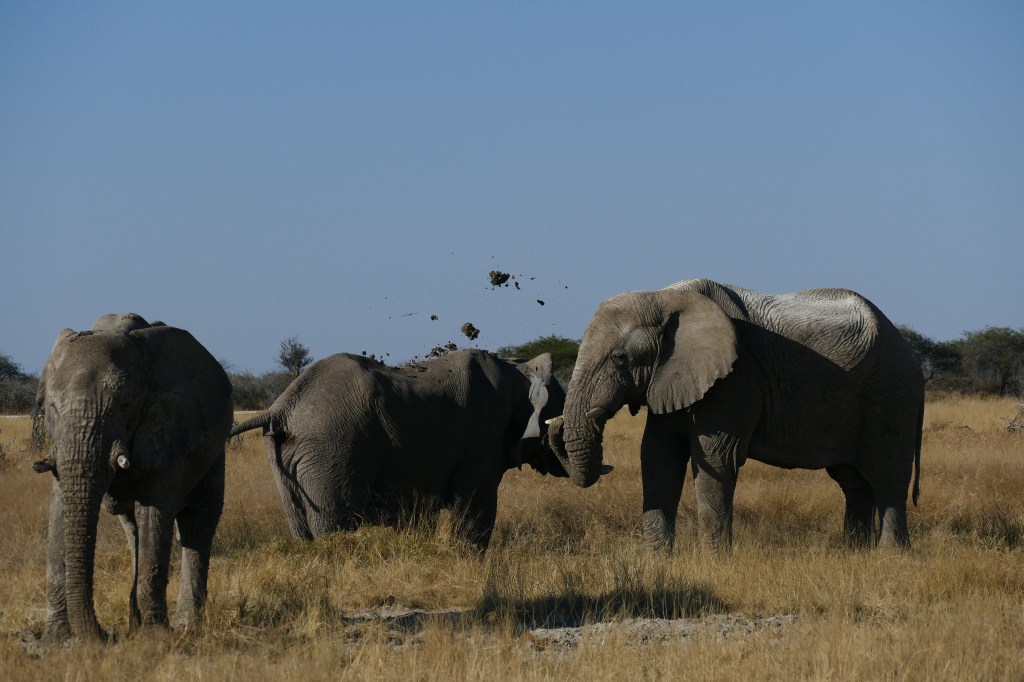 On my last afternoon, I met those three elephant bulls. They had found a small water puddle next to the road and threw a bit of remaining mud around. Not enough to cool them down but I assume that every bit of moisture helps.