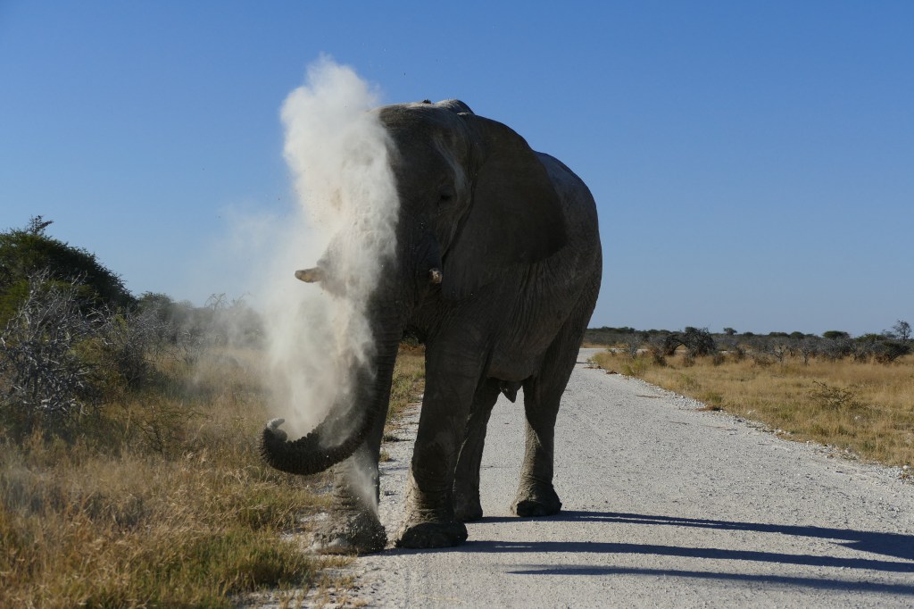 Once everybody had enough of the mud, they started to move on to the other side of the road. Even though I had not moved for the last half hour and was not in his way, one started showing off a bit, throwing sand all over his body to intimidate me and to make sure who has the right of way.