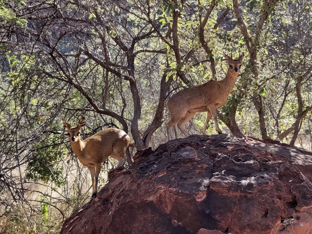 When moving in, a klipspringer couple came along, not being very shy. These diurnal and territorial animals are monogamous and often found in pairs or family groups. They are perfectly adapted to the rocky habitat they live in, and the Waterberg suits their needs quite well. They belong to the even-toed ungulates and walk on the tip of their toes which enables them to jump around on rocks as if this is the easiest thing in the world. They have very prominent preorbital glands in the corner of their eyes from which they secrete pheromones that they rub on shrubs and trees.