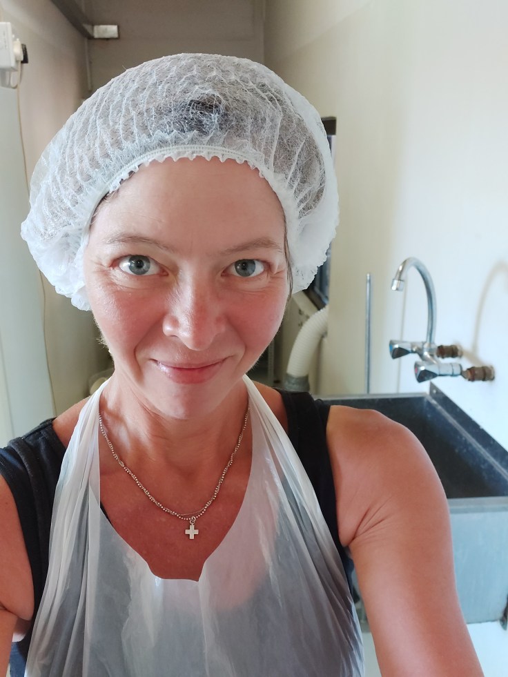 CCF has not only a model goat farm with goats and sheep but an own creamery where the milk from their own goats is used to produce dairy products like cheese, fudge, ice cream or soap and one day I had the opportunity to support the cheese making. Usually hard cheese, ricotta, chevre and feta are produced but our chef wanted to try a cream cheese recipe that surprisingly worked out quite nice.