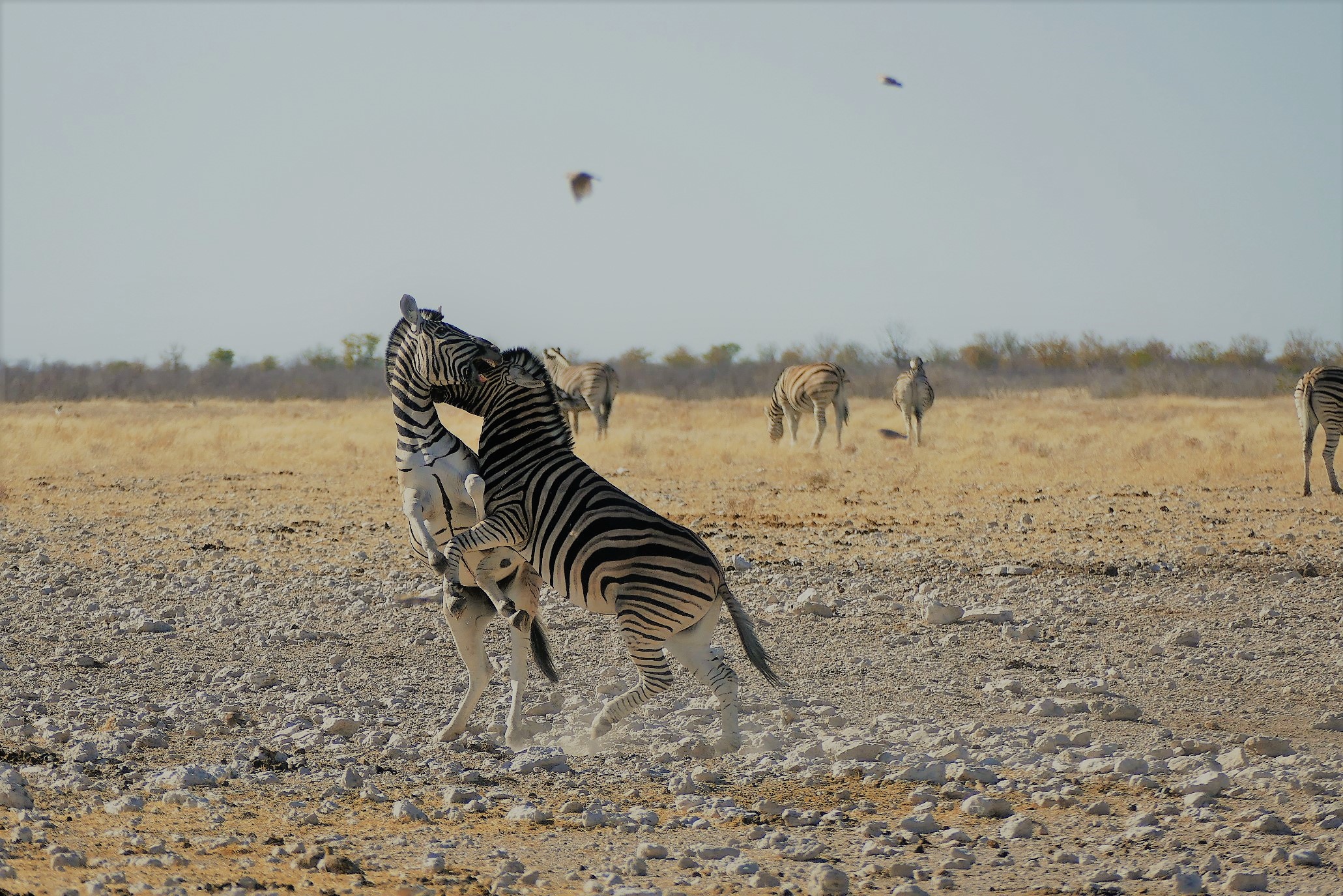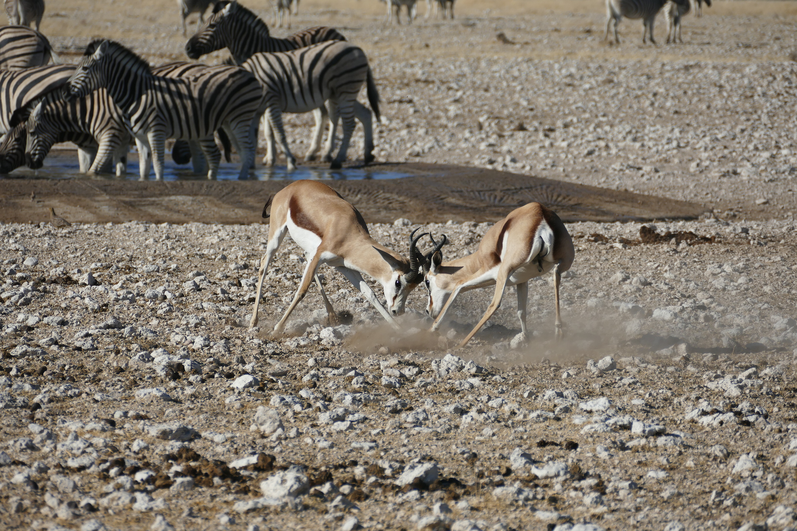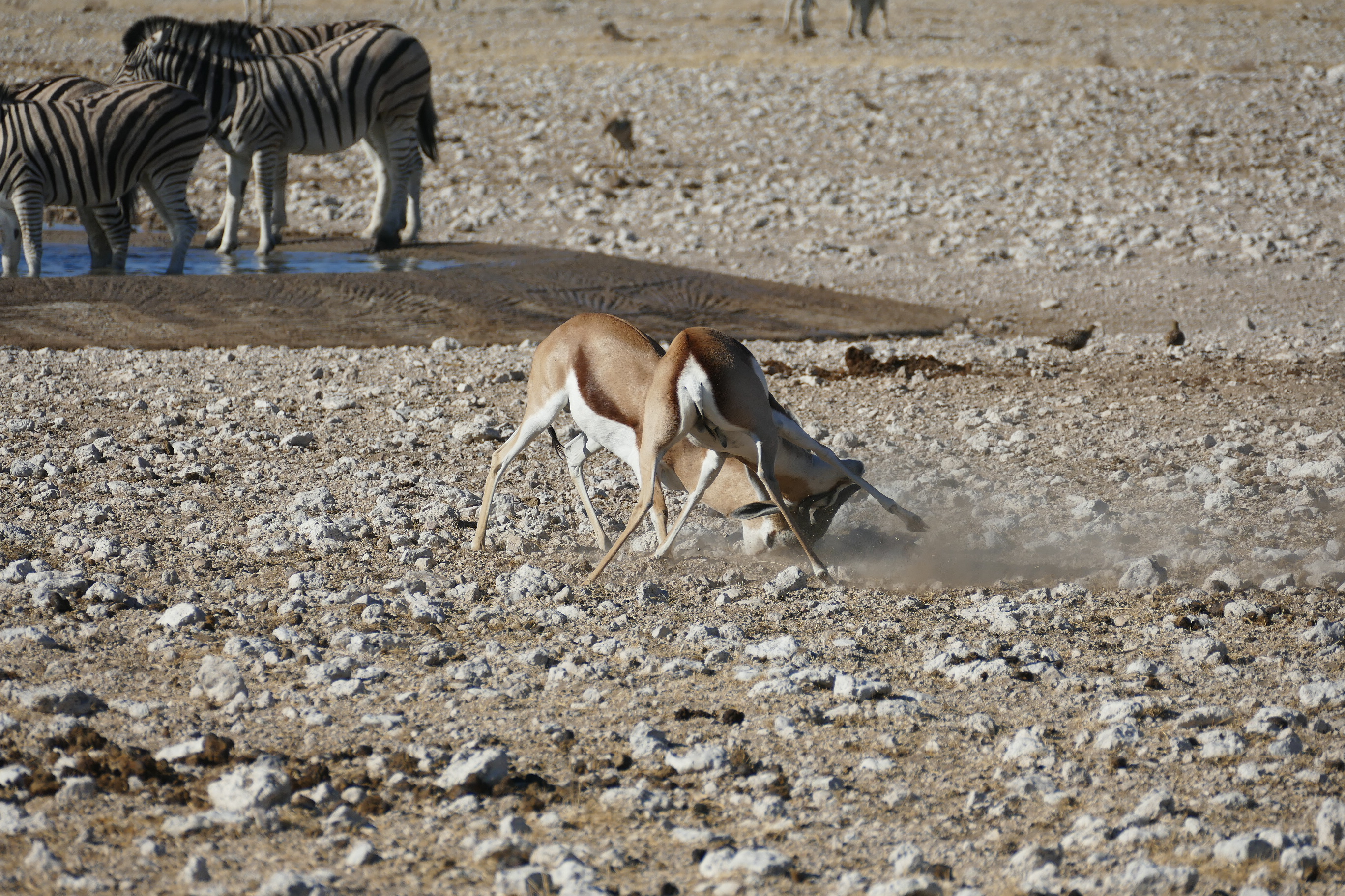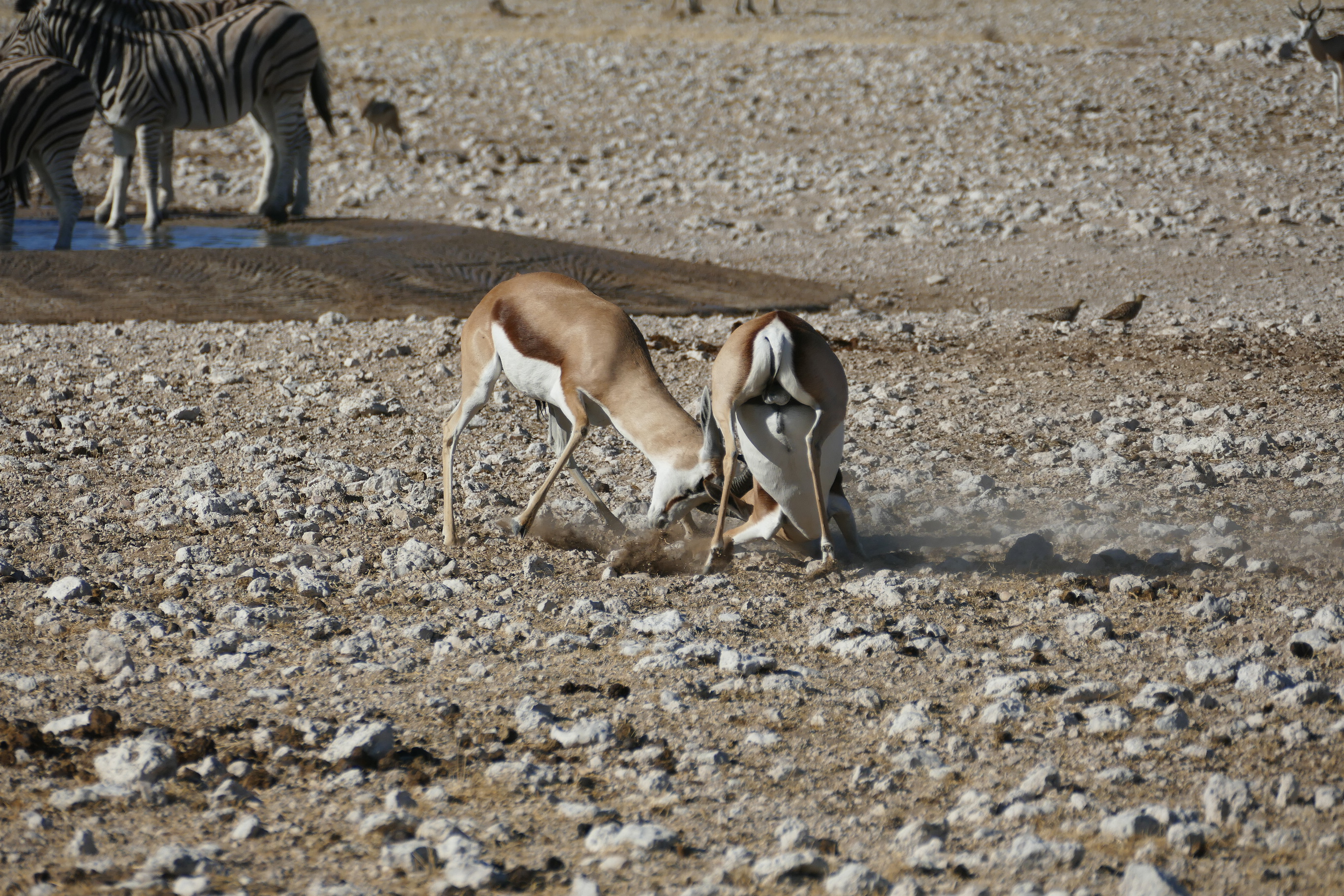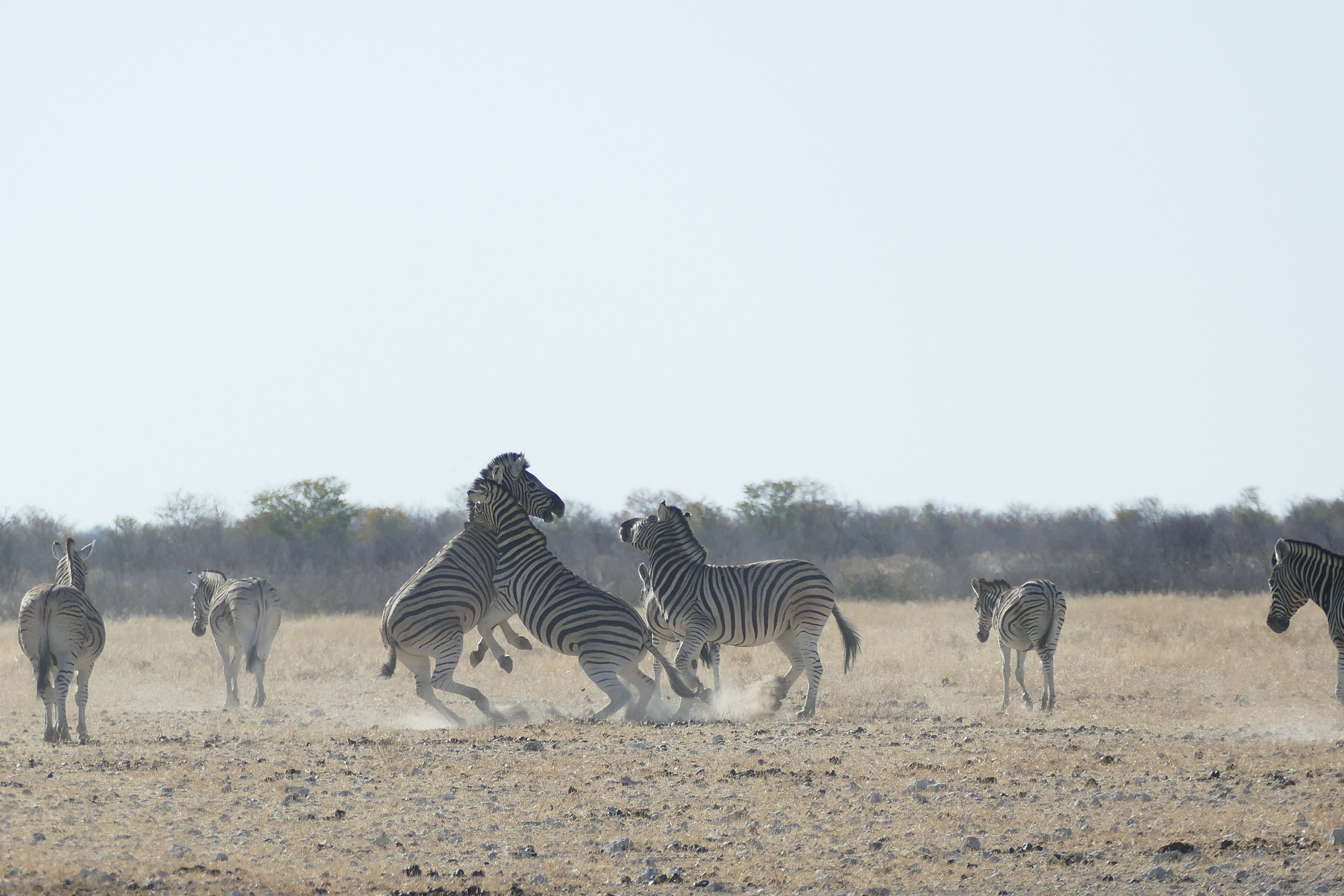 It is not only springboks that are a bit aggressive towards each other at the moment. Zebras are highly gregarious animals and form permanent, harem-based units with a core of females including their offspring, and a male – the so-called stallion – that leads and protects the herd. To do so, they fight with any other male that challenges him and you can see them trying to bite each other in the neck or the knees.