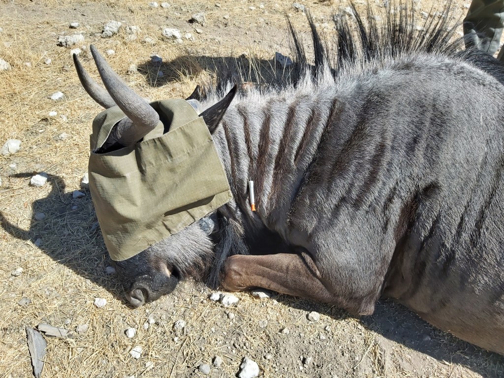 We have been out all day long, searching for these animals. Most of the collars still work so it is relatively easy to at least find their last location. But that does not mean they don´t move … it sometimes took a while until we found them. If we did … But locating them is not the end of the story. We had to get into close distance to dart them and especially the Wildebeest is not easy to outwit. They are clever and it often took us a while 😊