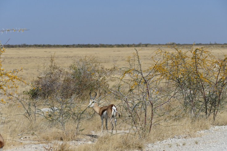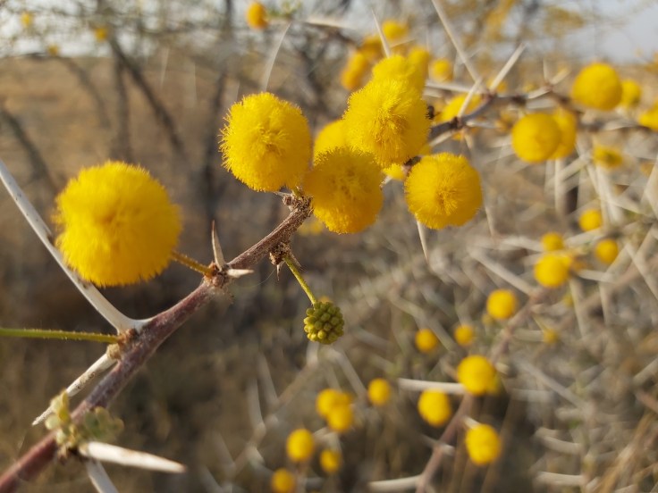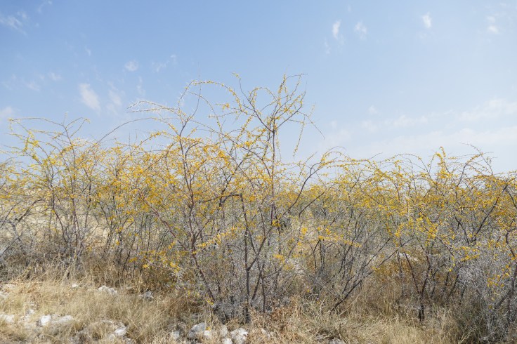 The Water thorn is one of the common shrubs here in Etosha and for the last months, I did not pay too much attention to it. Although I was impressed by its numerous straight, slender white spines, it was simply a shrub. But a couple of days ago, little yellow, fluffy ball-shaped flowers started decorating this untidy plant. In some regions they are so abundant that the area is dipped into a beautiful yellow and the air is filled with a nice, sweet scent. The smell of spring.