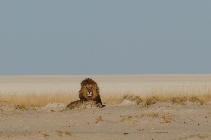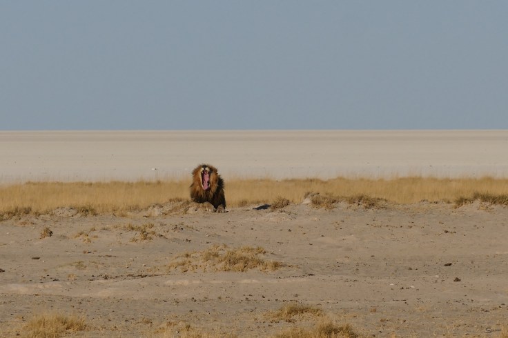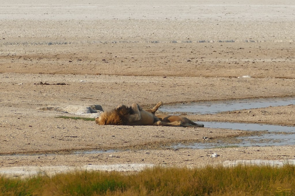 There was still some time left so I thought about taking a detour via Leeubron instead of driving home directly but just about 100 metres down the road, something dark on the last patch of grass before the Etosha Pan caught my attention. I could not remember any bush there so stopped and a look through the binoculars showed the smiling face of a sleeping lion with all four paws up in the air. His gorgeous dark mane was forming a perfect contrast to the tawny grass. What a pretty boy. Bingo!