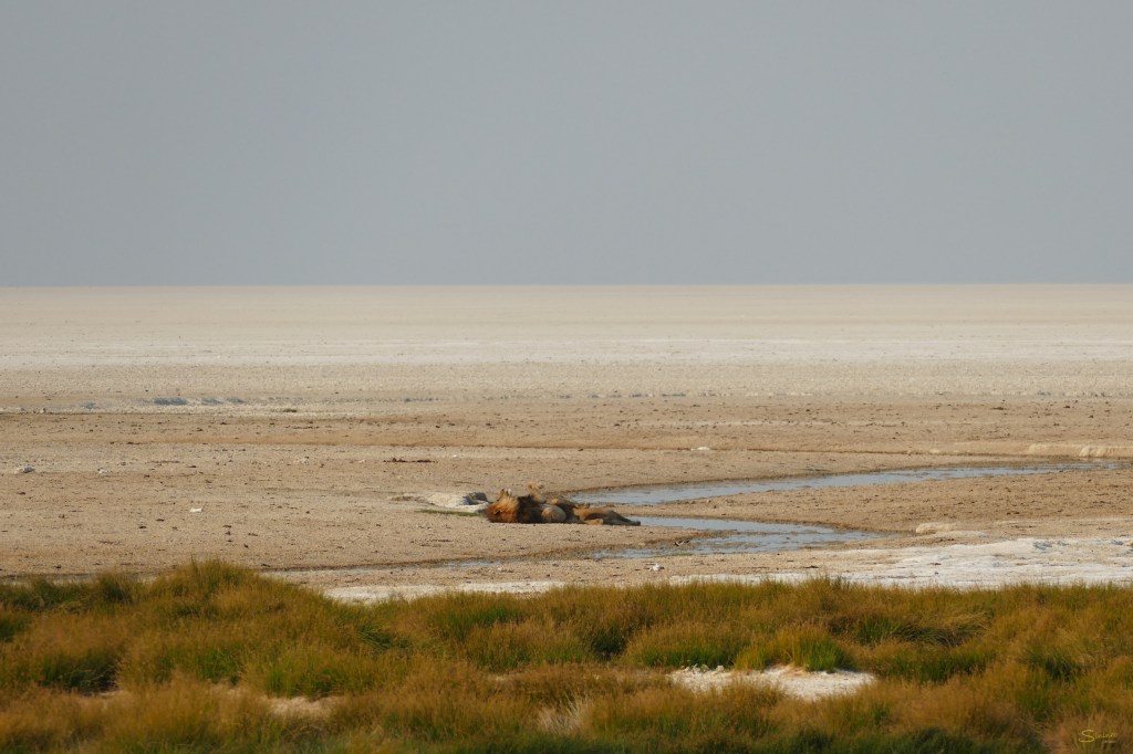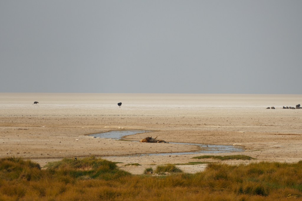 A couple of days later I went back to Okondeka and was not disappointed. The lions were still there (or maybe again), and still occupying the remaining water. I personally find that a bit mean. Considering that lions anyway sleep the most time during the heat of the day, they could find themselves a nicer spot instead of blocking the way to the precious water for all the other animals that are desperate to get there.
