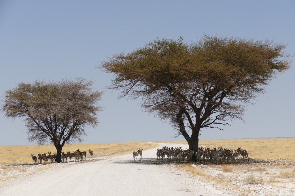 A herd of springbok is obviously thankful for some shade. The only one within a radius of a couple of kilometres.