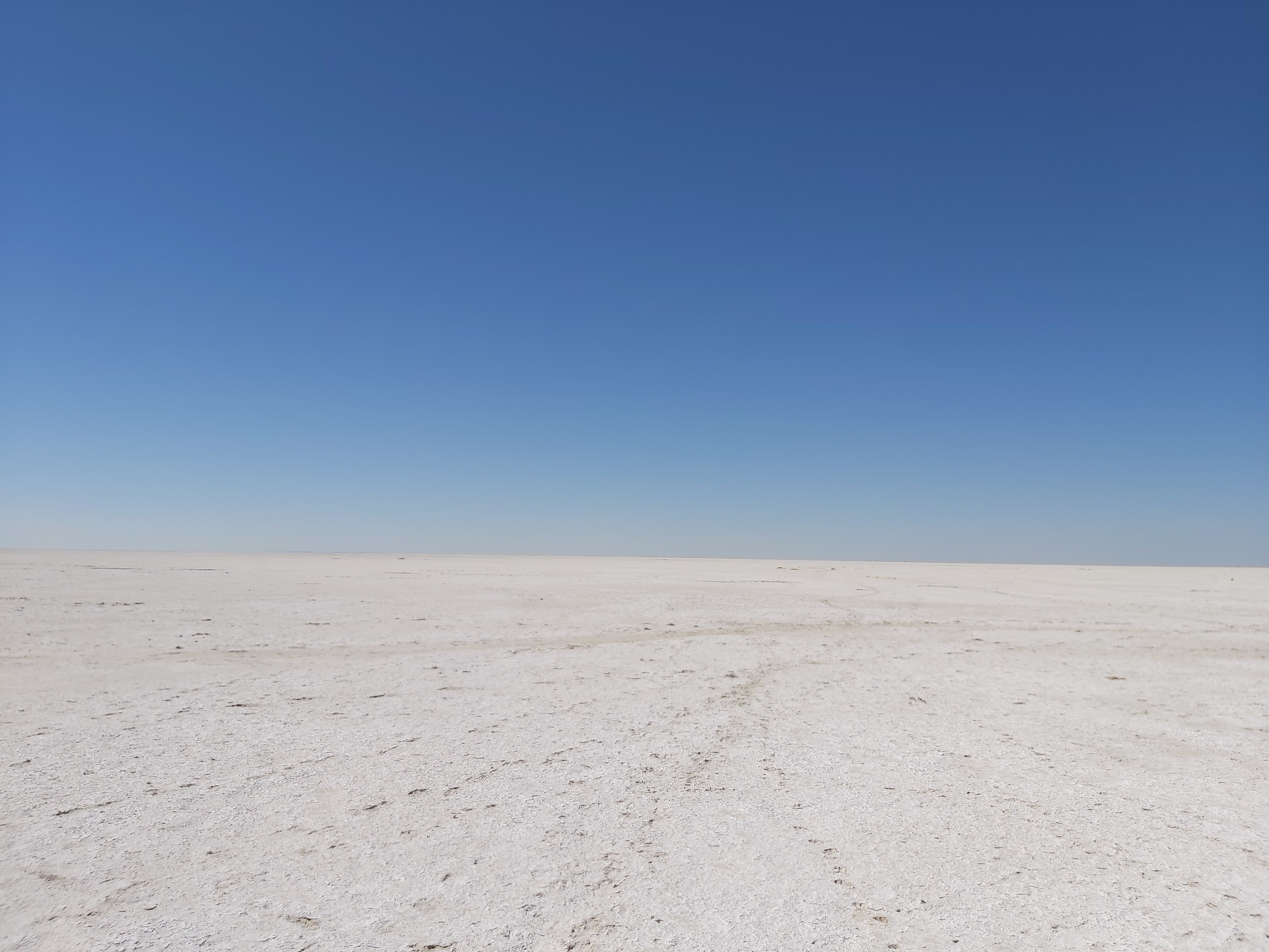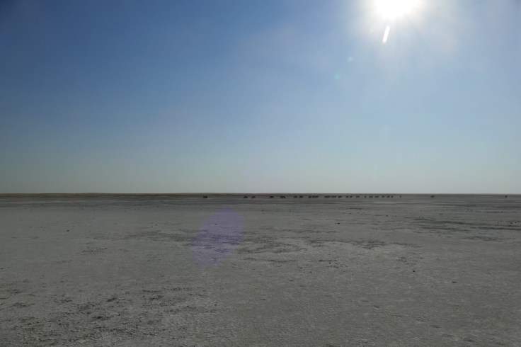 The view is endless, the salty soil cracked into hexagonal shaped pieces. A few hoof prints are still visible from the times when the rain had transformed this area into a muddy place some months before and spooky game paths lead deeper into the pan. The heat is unbearable, and even with sunglasses my eyes soon start itching due to the brightness.