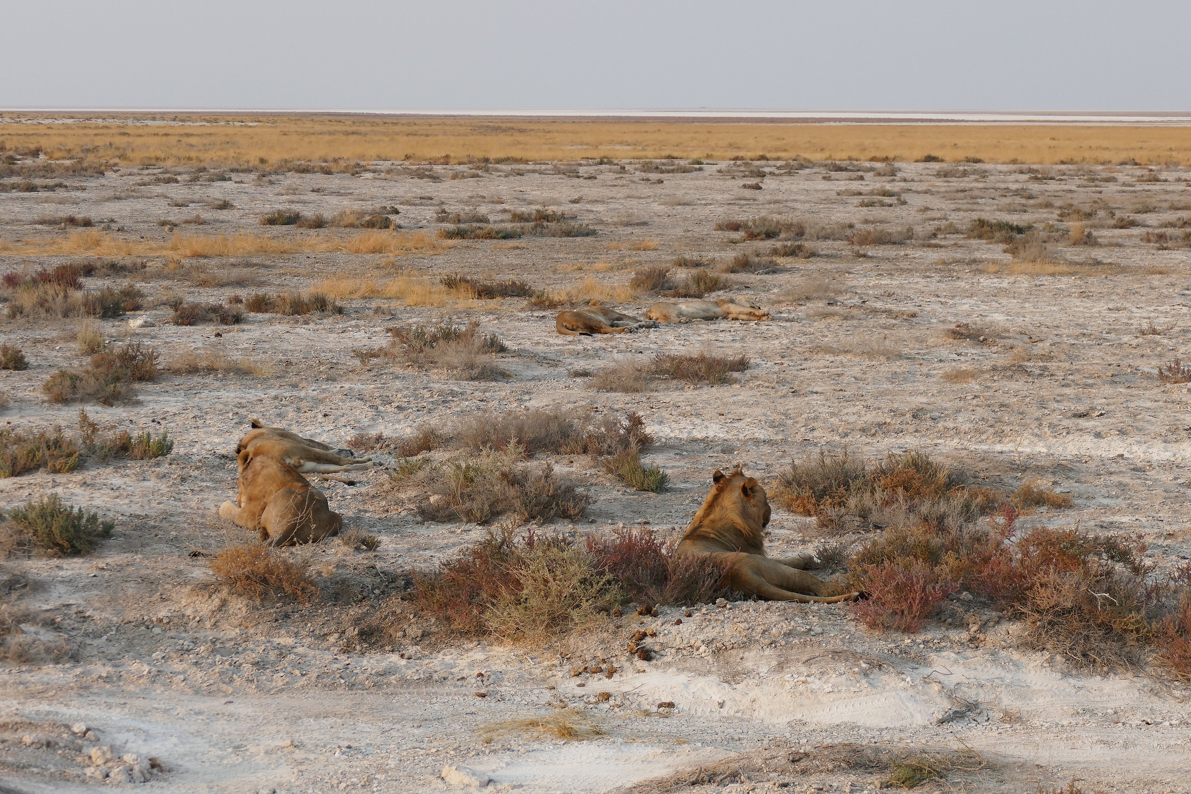 With the setting sun it also cooled down and the lions became more active, started grooming, went to the toilet (no joke!) and wandered around. Especially one of the lionesses seemed to see something interesting and when I followed her gaze, I saw a couple of hyenas approaching.
