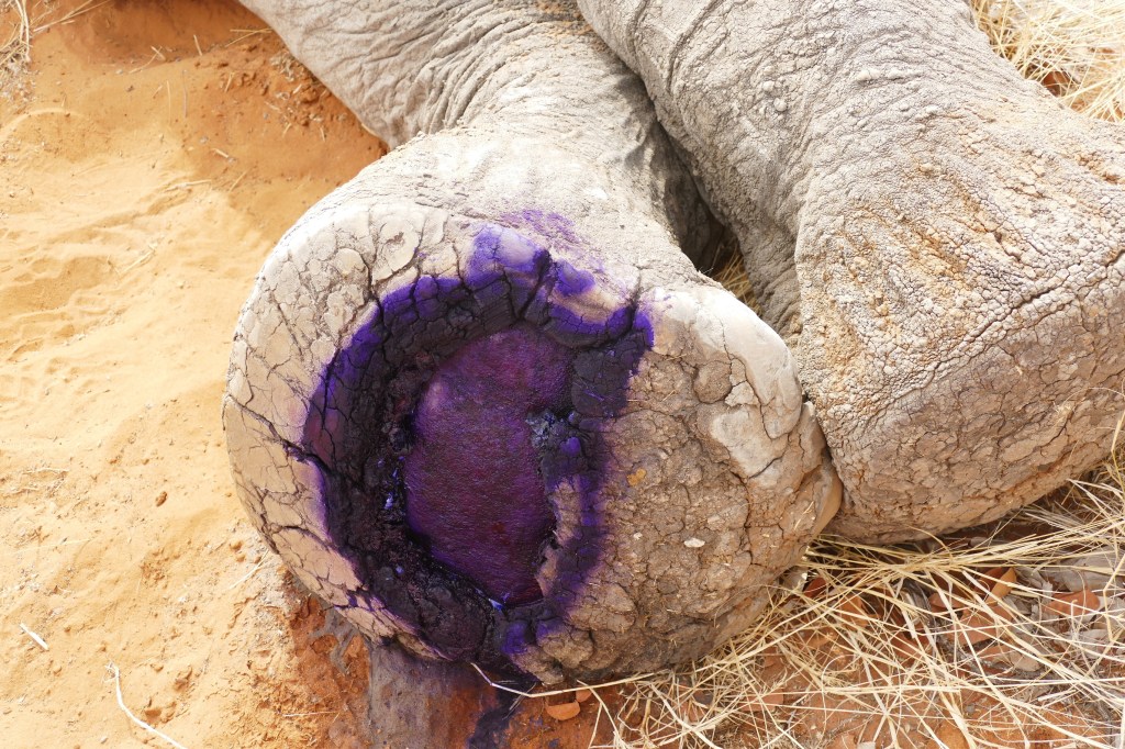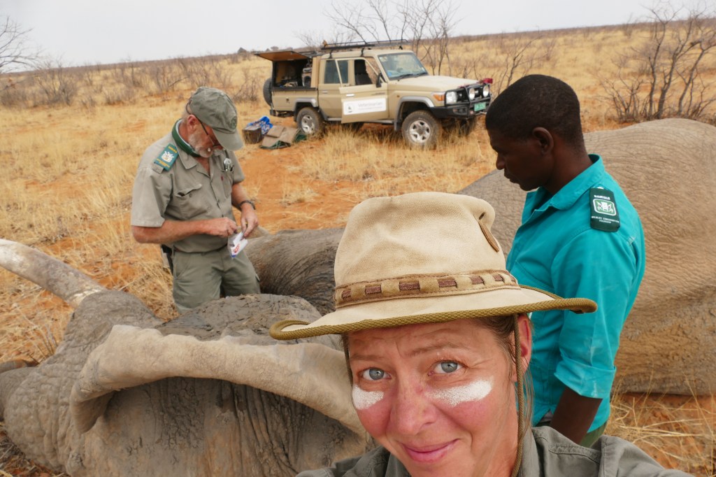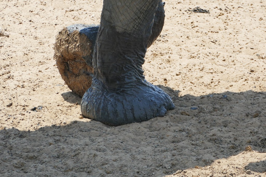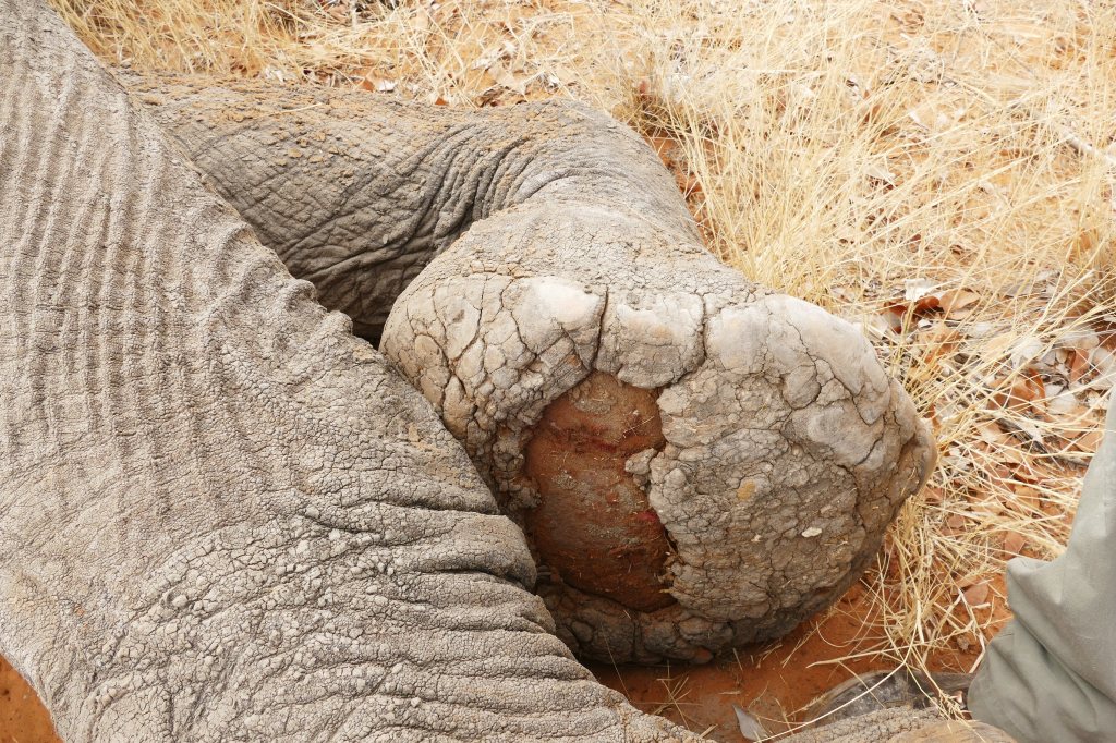 When I finally arrived, I met an “old friend”: a couple of weeks ago, we had treated an elephant bull here. He was reported limping and after some investigation we found out that his foot sole had a big hole in it. Not like a blister that had opened, but a massive hole! Axel had darted and treated this old man and I hoped that he was doing better, but he still walked awfully slow, resting his leg after every step and it seemed to be still painful on the hot soil. Poor thing, I really hope he is getting better soon!