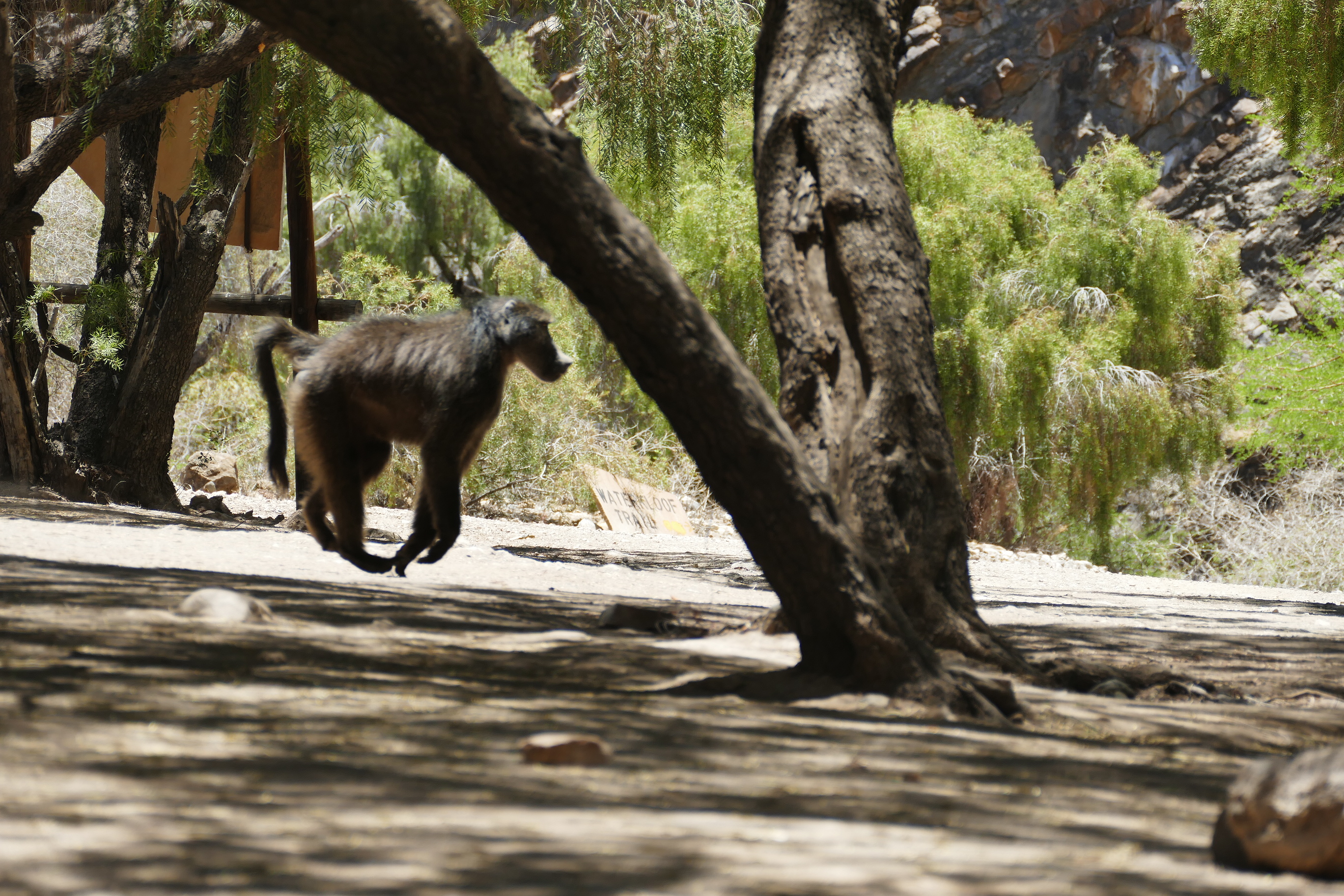 Baboons are curious animals and adapt quickly to humans, not shy to come close and always trying to steal anything they can get. They are strong and weaponed wit long, sharp teeth, but the normal reaction to us is flight. So that is what I expected when I got up and approached this guy, shouting on him and waving arms. But when I came around the tent, the big boy was not running away as I thought, but even approached me, baring his teeth and growling. Upsi … that didn’t go according to plan … I thought, screamed, turned around, and ran towards towards the safety of my camping companion in hope the baboon would not want to fight the two of us – what he luckily didn’t! My word, these baboons are vicious!