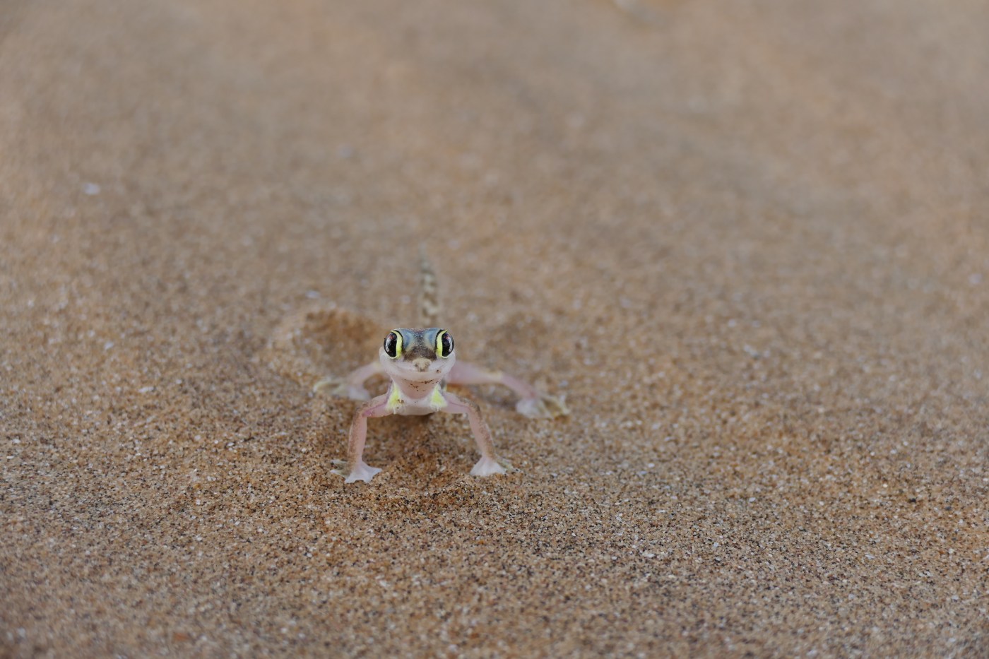 One of most striking creatures of the Namib desert is definitely the friendly-looking Namib dune gecko, a highly adapted reptile that is endemic to this part of the world. Most of the moisture it retrieves from its prey, insects like crickets, spiders and grasshoppers, but on top, it has learnt to extract moisture from the constant fog that especially appears from the evenings to the mornings: the large eyeballs are used to condense the moisture and once drops have accumulated, the gecko licks its eyes with its tongue.
