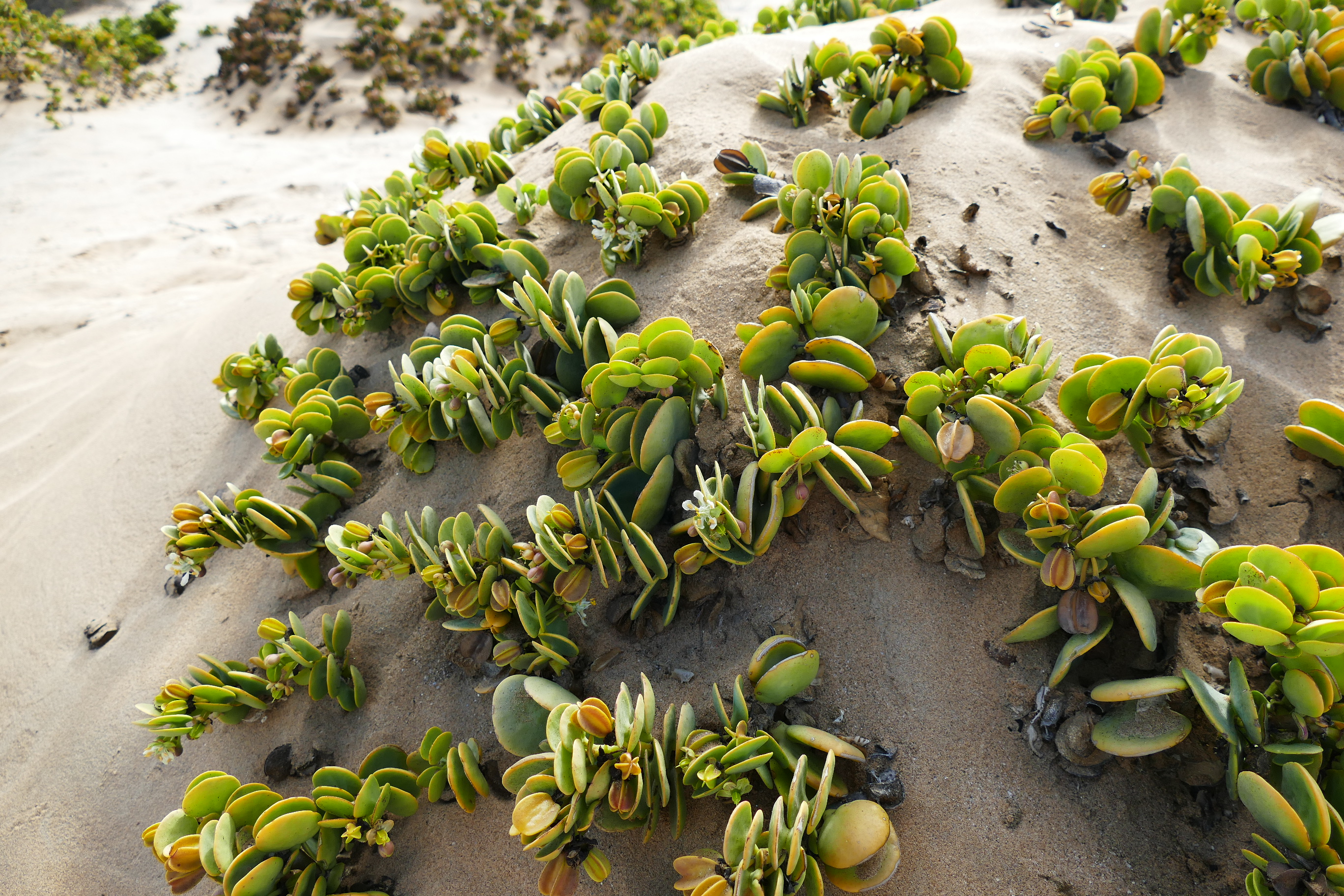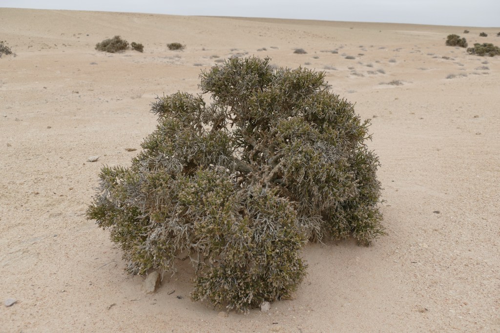 We were introduced to some plants that over time have adapted to the harsh conditions and clearly dominating in this area is the endemic Dollar bush (Zygophyllum stapffii), a leaf succulent. It only grows from the central Namib north into southern Angola. It got its name from the round leaves that resemble coins and these leaves are the survival feature of this plant: during the day they position themselves in a way that the surface limits the exposure to the sun, and therefore the evaporation of water. In the evening and during the night (or on overcast days), the leaves will fully open during the colder and more moisture parts of the day, collecting every single drop of water that floats in the air.