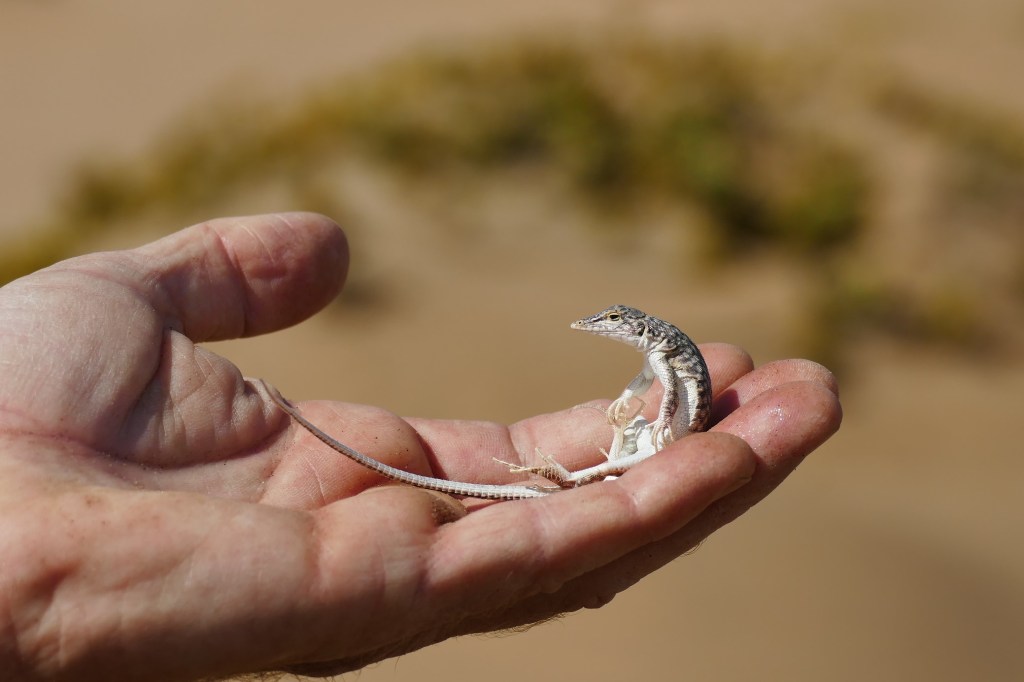 One more four-legged reptile crossed our way: the Reticulated Desert Lizard, a fast little thing that wsa a bit nervous first but calmed down after some belly massage. It is easily recognisable by its long pointed nose and speckled gray/blue body coloration.