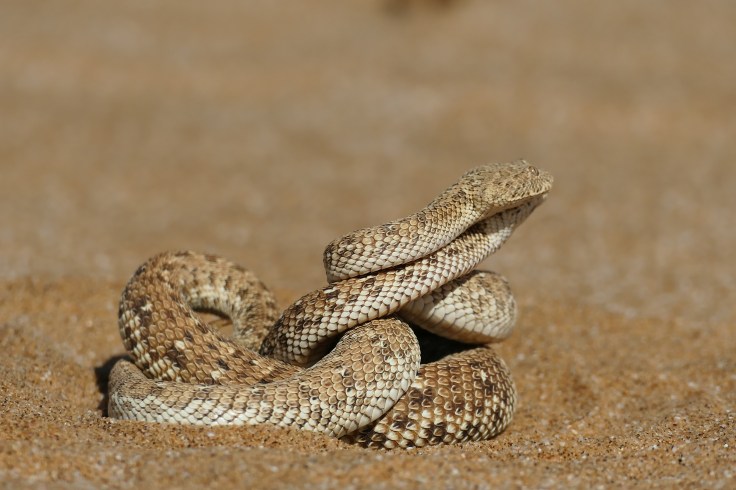 Sidewinder snakes made our day! They are not so easy to find and we got TWO of them, heavily involved in their mating procedure. I had always thought they were bigger, but with a size of only about 25 to 30 cm one of the smallest adder species in the world and therefore also called “dwarf adder”. The name “sidewinder” comes from their sidewinding movement on the slippery sand surface and as this keeps most of the body off the sand, it is a tool to prevent overheating. Their eyes are on top of the head which allows them to burrow under the sand and still keep its eyes out surveying the surrounding area for prey. This makes it hard for us to see them or even step on them which should be avoided as their cytotoxic venom is not deadly but can inflict a nasty and extremely painful bite.