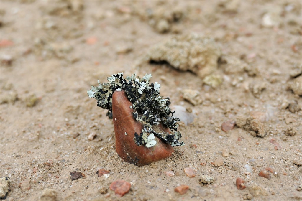 Look carefully at the ground to see these small ‘plants’, which are in fact the result of a symbiotic relationship (ie: a mutually beneficial relationship between two organisms, each depending on the other for its survival) between an alga, producing food by photosynthesis, and a fungus, providing a physical structure. If you look closely, you’ll see many different types of lichen. Some are thought to be hundreds of years old, and all are exceedingly fragile and vulnerable. (http://www.namibia-travel-guide.com)
