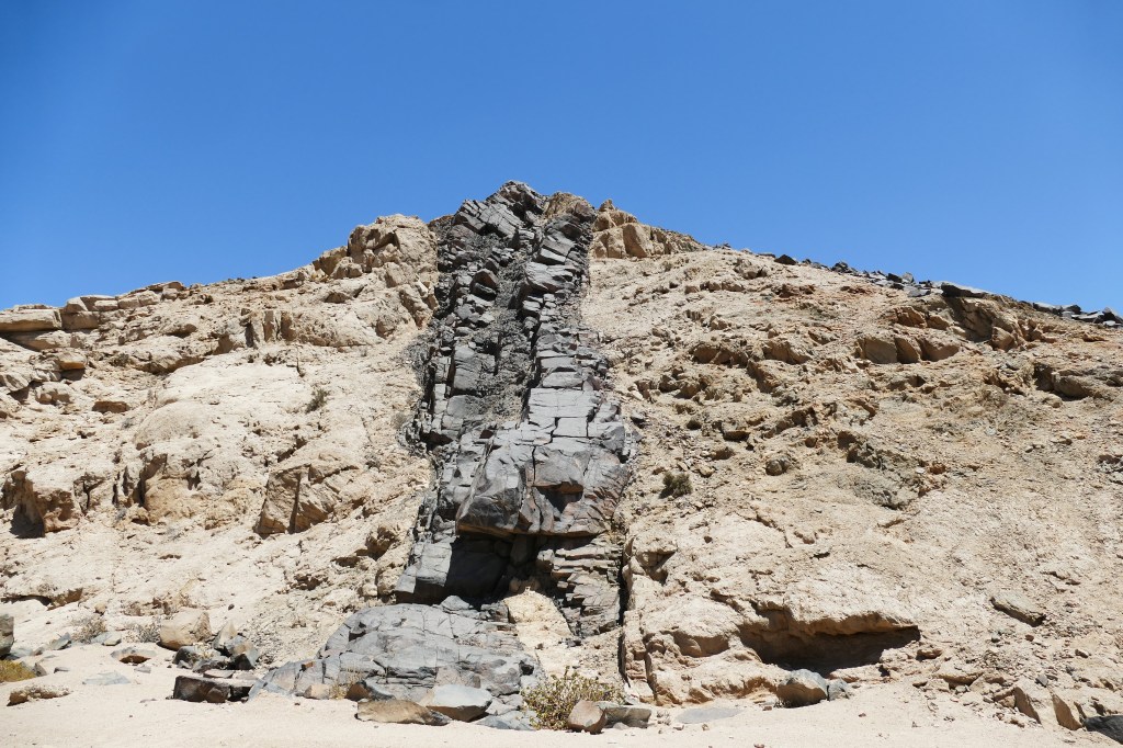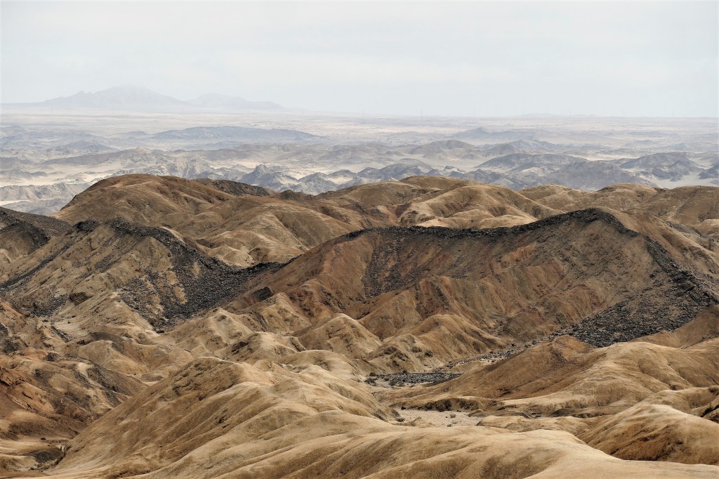 These dark strips of rock, which are a common feature of this part of the Namib, were formed when molten lava welled up through cracks in the existing grey granite. After cooling it formed dark, hard bands of rock which resisted erosion more than the granite – and thus has formed the spine of many ridges in the area. (http://www.namibia-travel-guide.com)