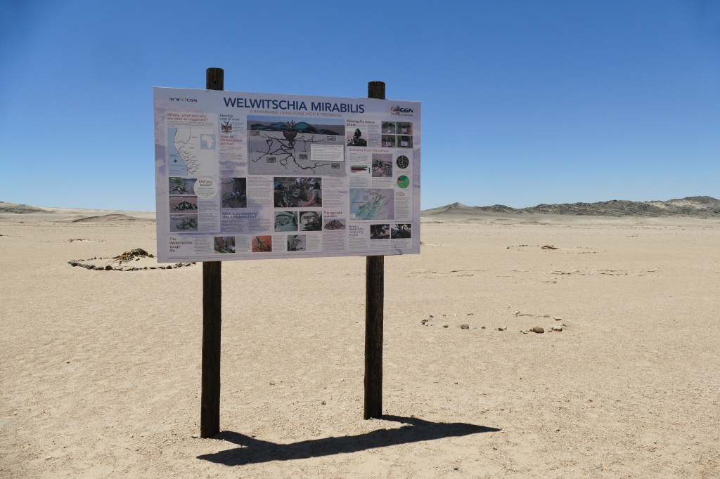 This beacon marks the end of the trail, and one of the largest Welwitschia mirabilis known – estimated at over 1,500 years old. (http://www.namibia-travel-guide.com)