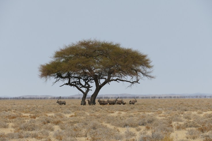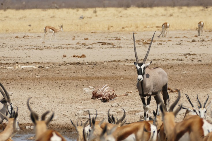 To cope with the high temperatures, they have different strategies: Seeking shade or a breezy spot is one of their tactics but more fascinating are the ones that are not so obvious. One is the carotid rete system. It fools the brain and pretends the body does not need cooling. In addition, heat from the blood is dissipated in the nasal passage, therefore cooling down on its way to the brain and avoiding brain damage that usually occurs at temperatures above 43°C. Beside those mechanisms, gemsbok also save water wherever possible. Their diet provides them a good base for moisture intake, and to prevent loss of water, the urine is highly concentrated and the Oryx’s´ droppings are very dry. In the Etosha NP, I regularly see gemsbok walking and resting in the Etosha Pan where for kilometres no water is in reach and temperatures easily go above 45°C during the day.