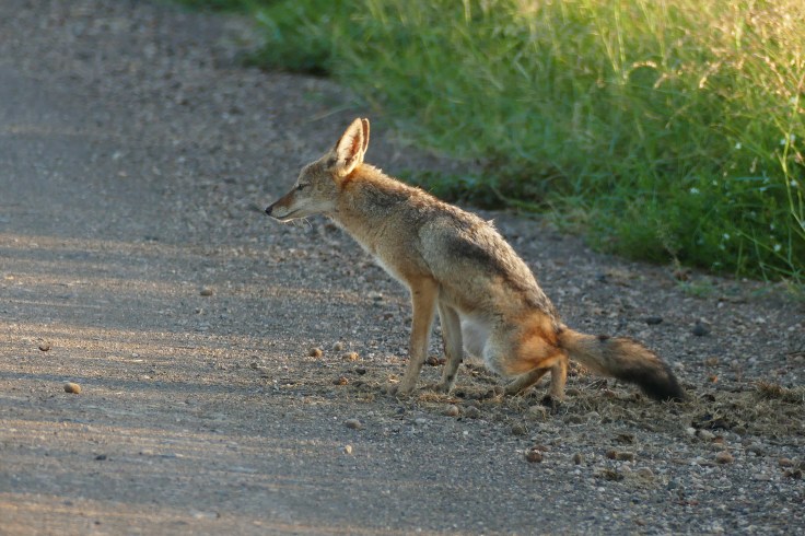 Late afternoon and in the evenings, listen for the distinctive wailing call of the Black-backed jackal which is mainly used to locate and communicate with family members and usually answered by them within a short timeframe.