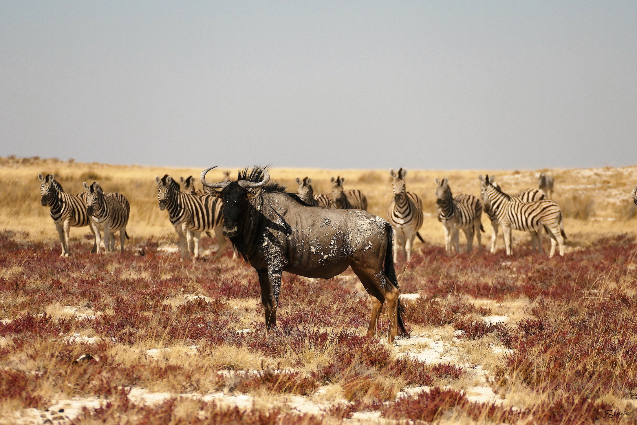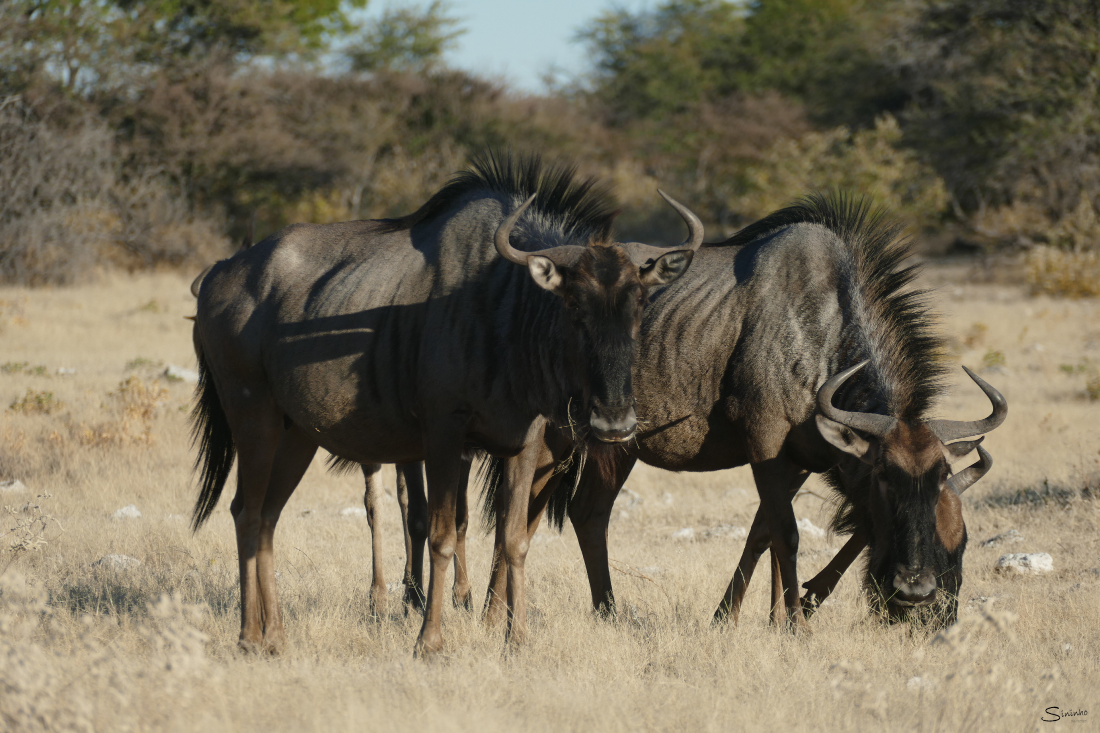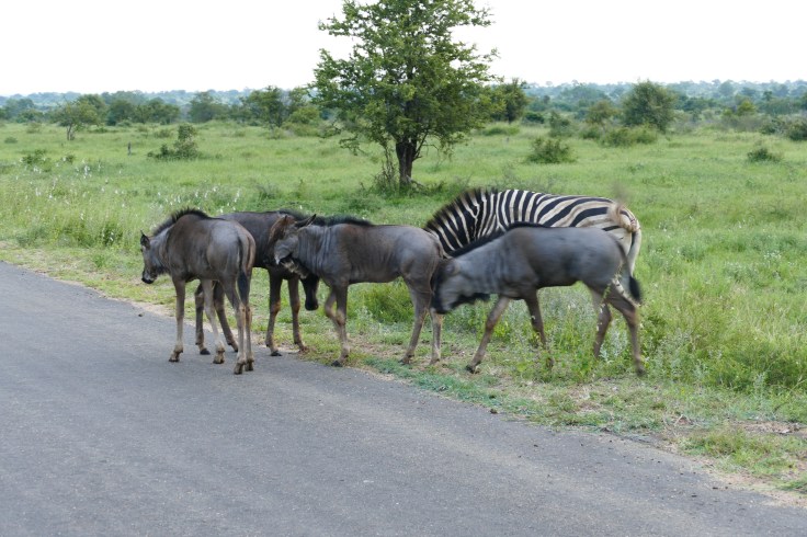 Blue wildebeest can often be seen together with Plains zebra. Both species are grazer but as the zebra prefers long and the wildebeest shorter grass, they do not compete over food. It might be coincedental that they mix but it provides a better protection towards predators as more eyes see more and both species react on the alarm call of the other one.