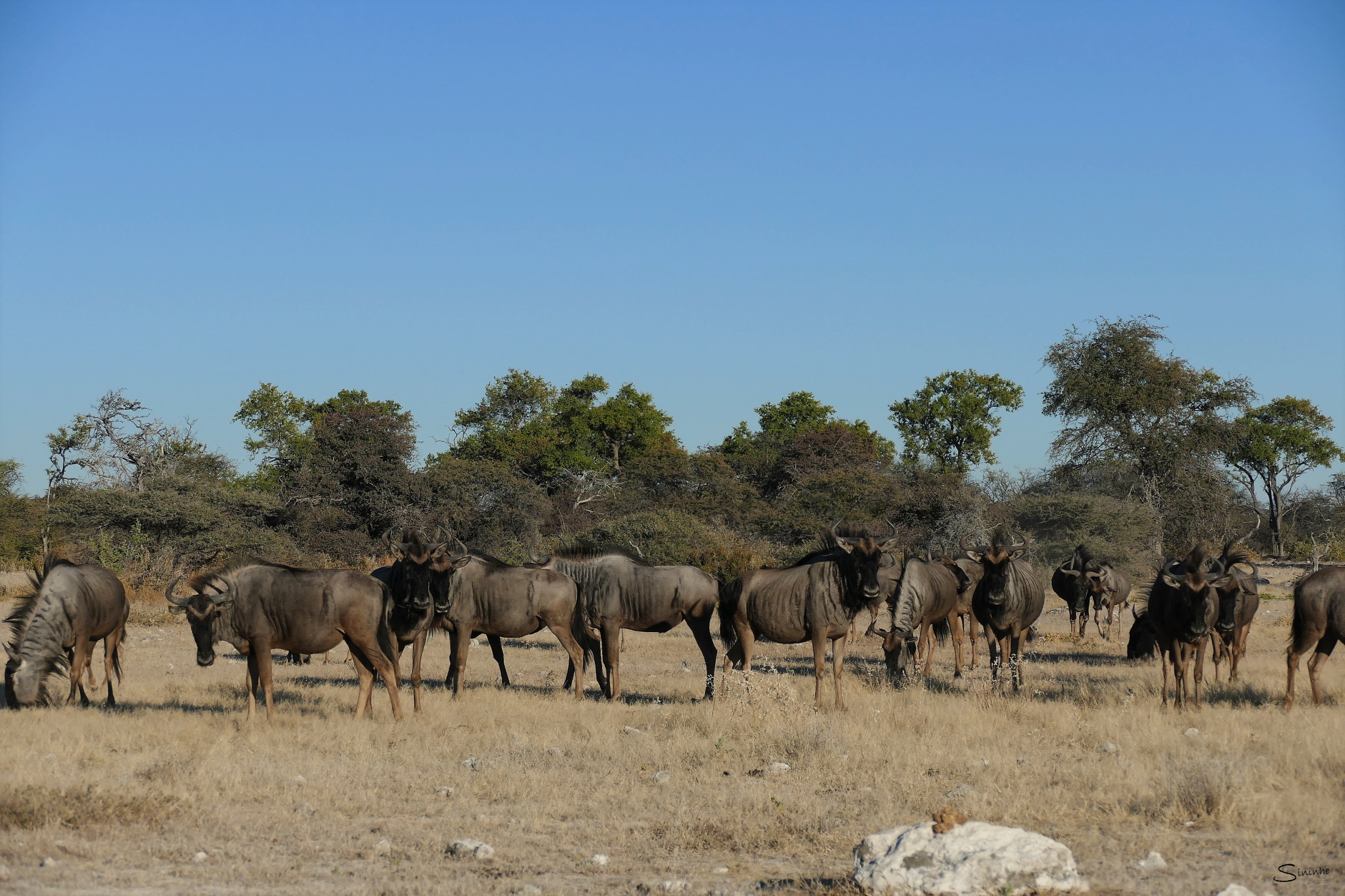 | When I “lived” in the Etosha Park, I stayed close to the fence and one day around lunch decided to have a quick look if I see something interesting out there. It is only about 40 meters to the fence but the path is full of stones and grass so it is nearly impossible to walk silently. I did my best to avoid any noise but when I arrived at the firebreak, a group of wildebeest was standing there, staring at me. They had just been on the way to the waterhole of of course they had heard me coming. I felt so bad. Around twenty faces where looking in my direction and as soon as I stepped out I saw their irritation that was expressed by constant “gnouing”. I did not dare to move any more and it took about half an hour before they relaxed and continued their way to the water. |