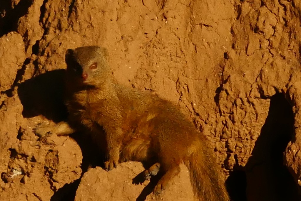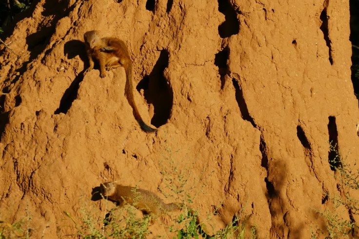 Mongooses are late starters – in the mornings, they can be seen lazy warming up in the sun, often streching on their favorite termite mound.