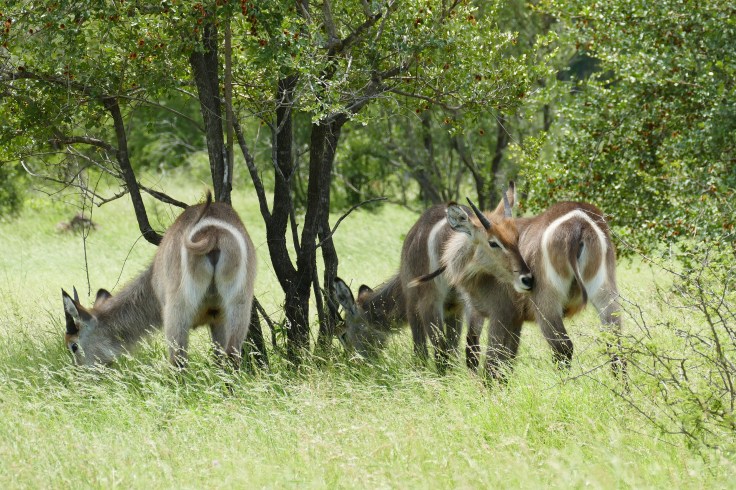 Waterbuck eat on a variety of grasses, both medium and short and they will feed on herbs and leaves if grass is sparse. Waterbuck are very water dependent and stay within a range of 2 km of it. The Waterbuck has a short rumination due to high water intake and fresh food.