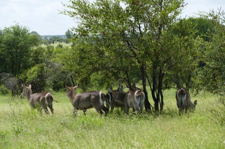 The waterbuck is a heavy, robust antelope with a stocky build and short, stocky legs, grey in colour with a white collar on the throat and a distinctive white ring on the rump.